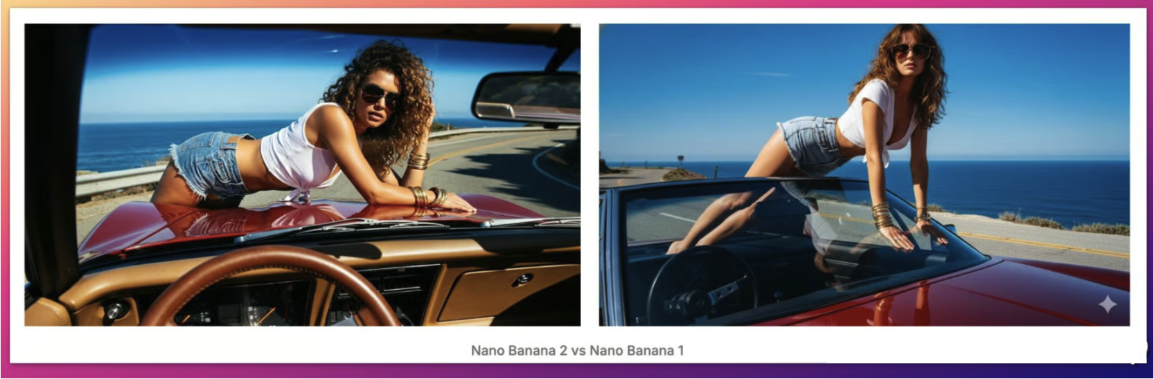 In the same prompt, “a girl leaning on the car roof,” Nano Banana 2 (left) delivers noticeably better lighting and texture. The illumination feels natural, the skin looks more lifelike, and even the car paint reflects light accurately.